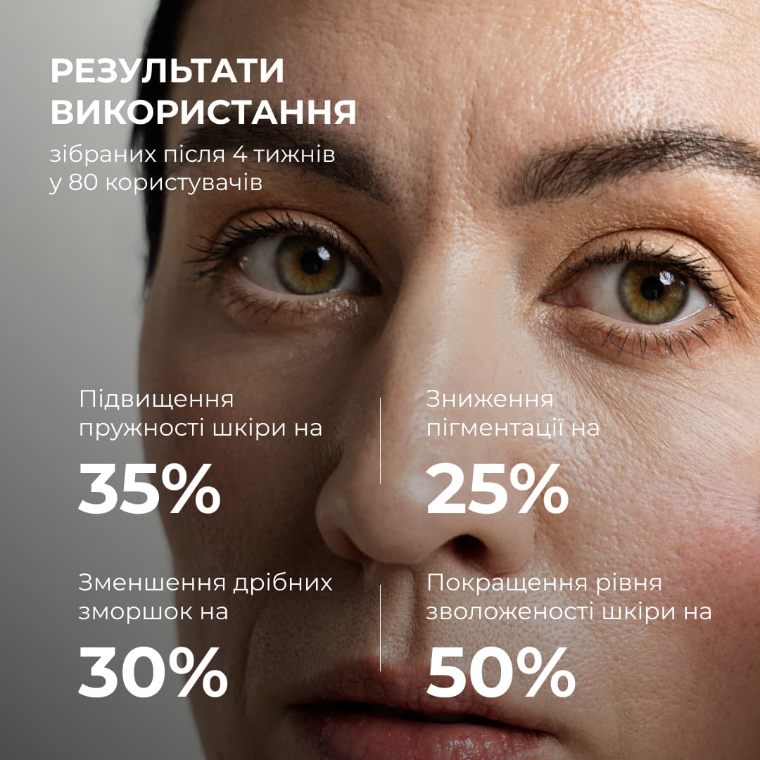 Після 4 тижнів використання набору значно покращився стан шкіри. Пружність шкіри збільшилась на 35%, що свідчить про значне зміцнення її структури. Дрібні зморшки зменшились на 30%, що додає шкірі гладкості та молодшого вигляду. Пігментація знизилась на 25%, вирівнюючи тон шкіри і надаючи їй здорового вигляду. Покращення рівня зволоженості склало 50%.