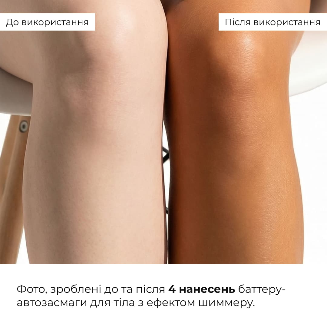 3. Баттер-автозасмага. Нанести рівномірним шаром на чисту, суху шкіру тіла масажними рухами. Після нанесення ретельно вимити руки. Зачекати, доки засіб повністю вбереться. Для більш насиченого відтінку використовувати щодня або через день.