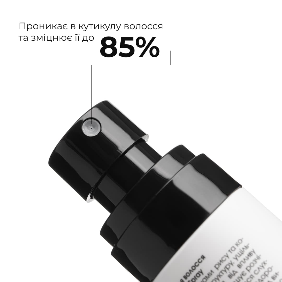 Незмивний спрей-догляд із протеїнами рису та коноплі огортає локони, покращує їх структуру, ущільнює та розгладжує. Захищає волосся від впливу несприятливих зовнішніх чинників, полегшує розчісування та укладку волосся. Спрей слугує термозахистом перед використанням фена або прасочки.