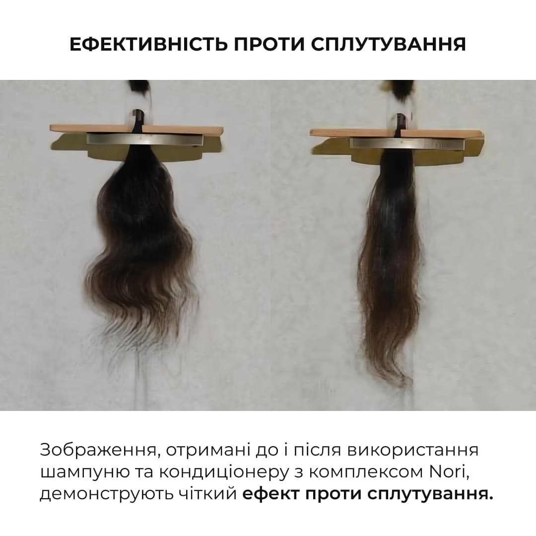 Шампунь та кондиціонер Nori забезпечують делікатне, але ефективне очищення шкіри голови, підтримують її гідроліпідний баланс і захищають волосся від негативного впливу навколишнього середовища. Формули на основі бурих водоростей зміцнюють структуру волосся, підвищують його еластичність і міцність, зменшують ламкість та запобігають сплутуванню й електризації.