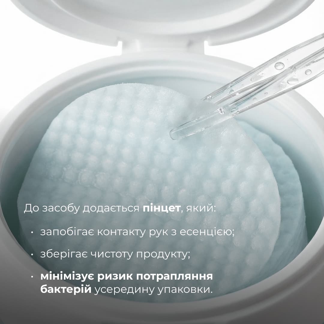 До засобу додається пінцет для зручного використання падів. Це важливий гігієнічний елемент, який запобігає контакту рук з есенцією, зберігає чистоту продукту та мінімізує ризик потрапляння бактерій усередину упаковки.