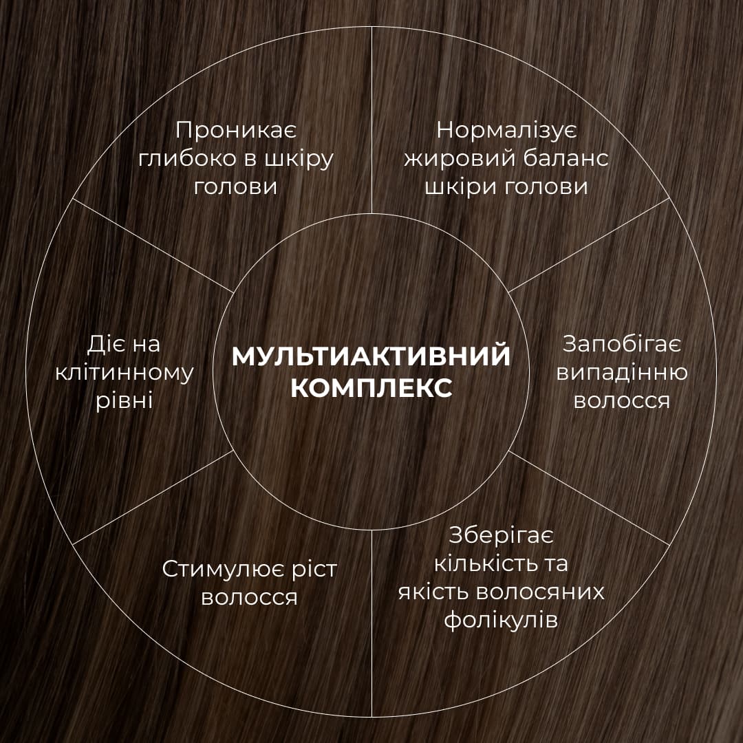 Мультиактивний комплекс з екстрактом шишок хмелю надає можливість відростити здорове, красиве, шовковисте волосся. Сироватка проникає глибоко в шкіру голови та діє на клітинному рівні, стимулює ріст волосся та запобігає випадінню волосся, зберігаючи кількість та якість волосяних фолікулів.