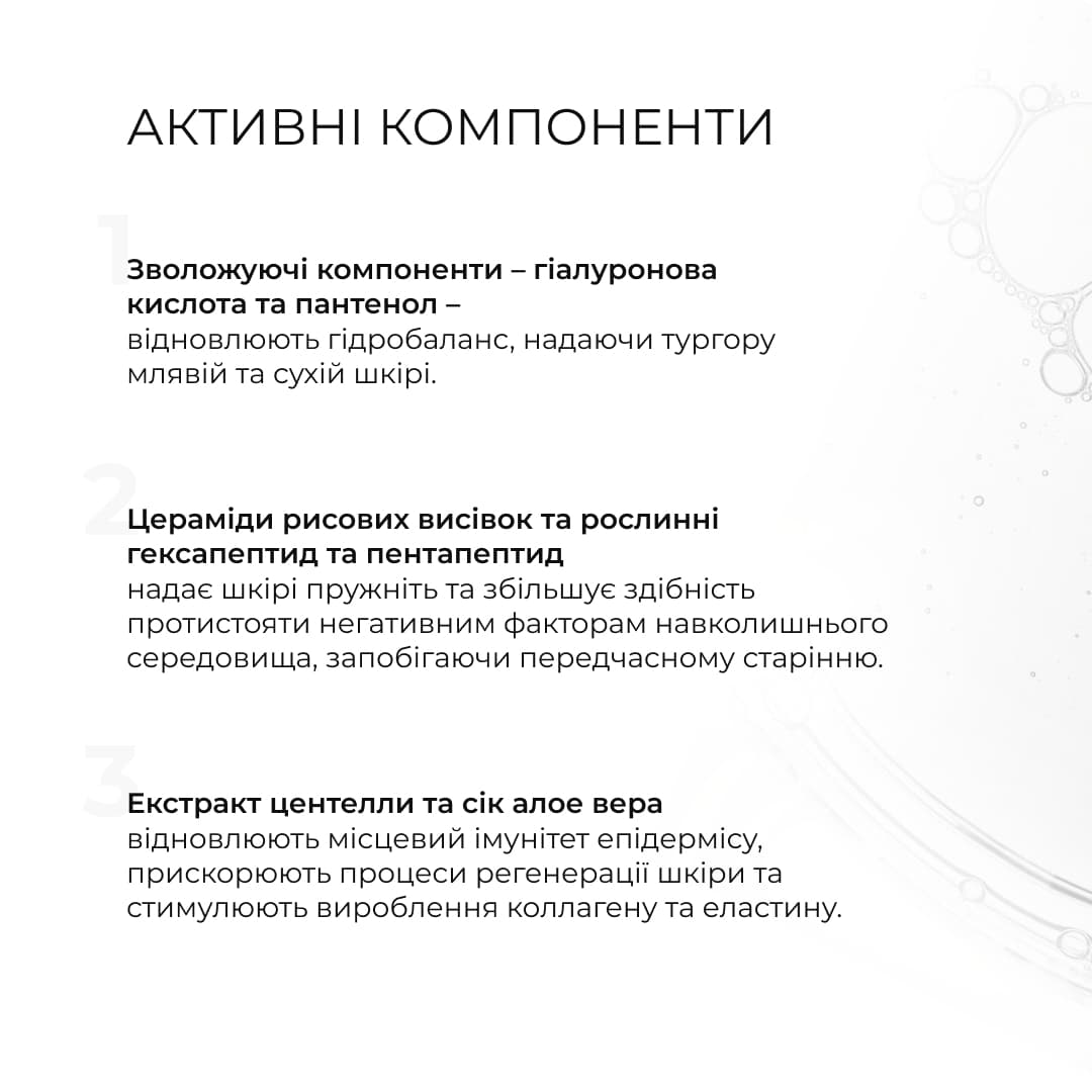 Гіалуронова кислота та пантенол відновлюють гідробаланс, а цераміди рисових висівок та пептиди ущільнюють шкіру, відновлюють її захисний бар'єр і запобігають передчасному старінню.