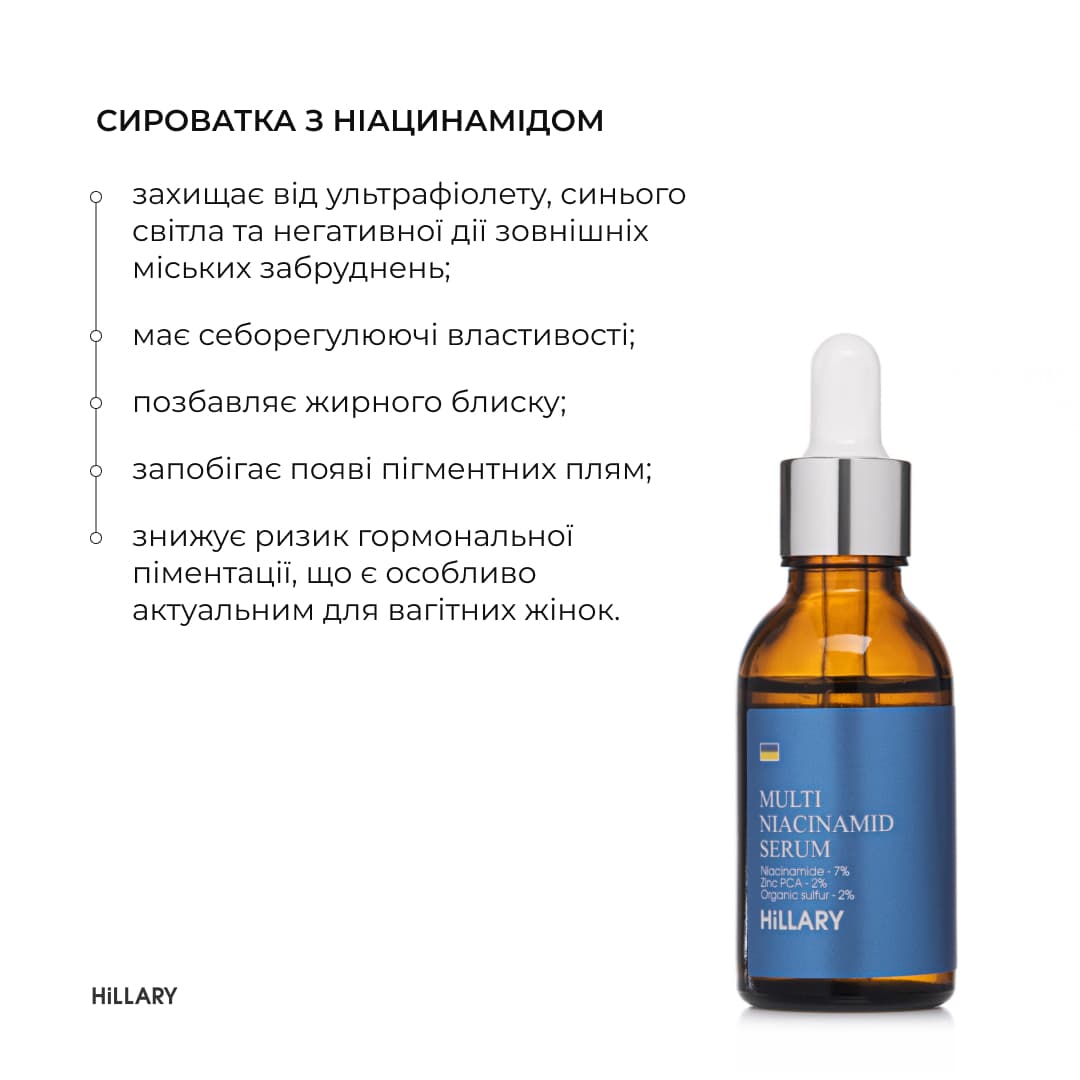 - Мультисироватка з ніацинамідом та цинком Hillary Multi Niacinamide serum, 30 мл;
