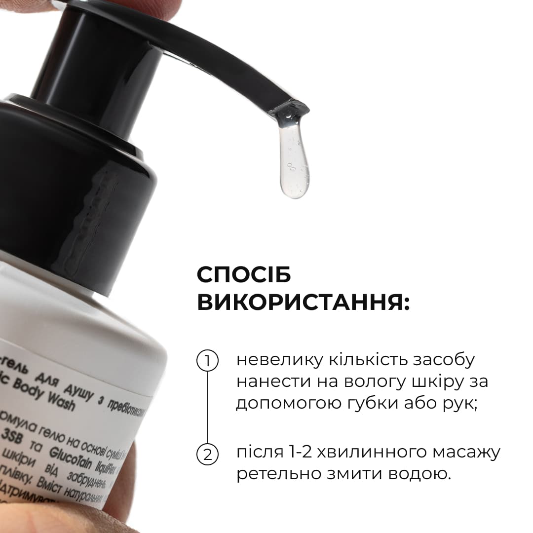 Крем-гель з пребіотиками. Невелику кількість засобу нанести на вологу шкіру за допомогою губки або рук, після 1-2 хвилинного масажу ретельно змити водою. Підходить для щоденного використання.
