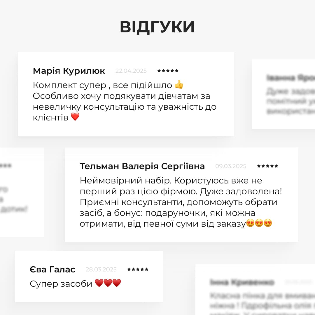 Регулярне застосування засобів допомагає відновити гідроліпідний бар’єр, вирівняти тон, повернути шкірі сяйво та природний здоровий вигляд. Зона навколо очей виглядає свіжішою, сліди втоми зменшуються, а загальний рельєф обличчя стає гладшим і доглянутішим.