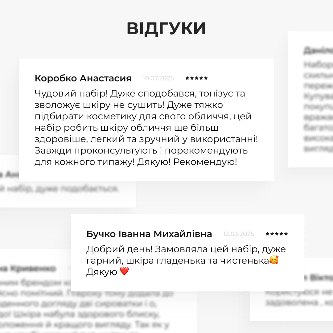 Набір допомагає боротися з тьмяністю, нерівною текстурою, періодичним жирним блиском, сухістю в окремих зонах, почервоніннями та втратою тонусу. При регулярному використанні шкіра стає більш гладкою та свіжою, звужуються пори, а тон обличчя вирівнюється. Підвищується зволоженість та пружність, зникає відчуття стягнення, а природне сяйво повертається щодня.