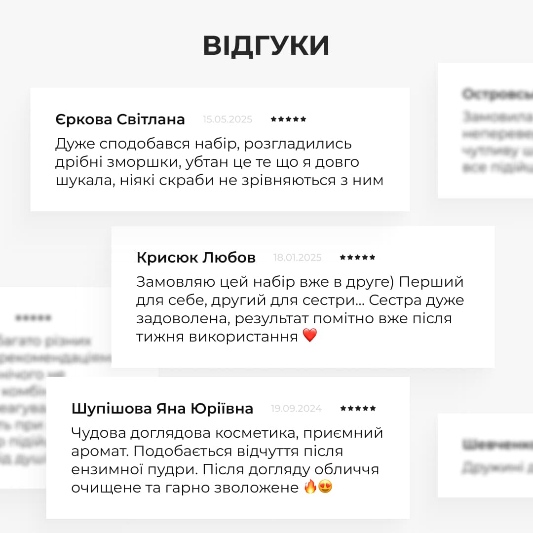 У результаті комплексного використання шкіра стає рівною, спокійною, наповненою вологою та природним сяйвом. Сухість і лущення зникають, подразнення зменшуються, а чутлива шкіра отримує необхідну підтримку щодня.