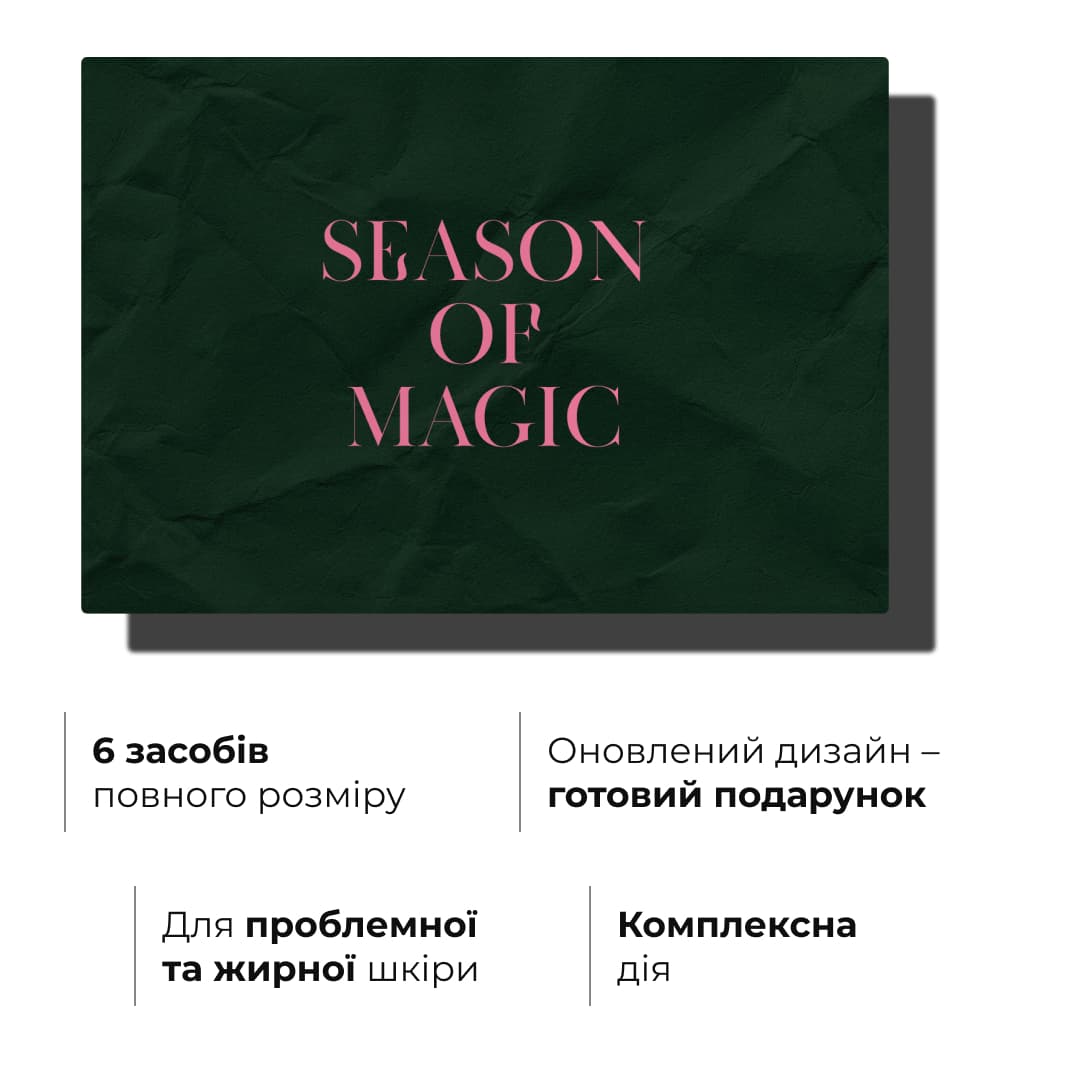 Подарунковий бокс для жирної та проблемної шкіри створений як розумний щоденний догляд для тих, хто бореться з надмірним себумом, висипаннями, запаленнями та розширеними порами.
