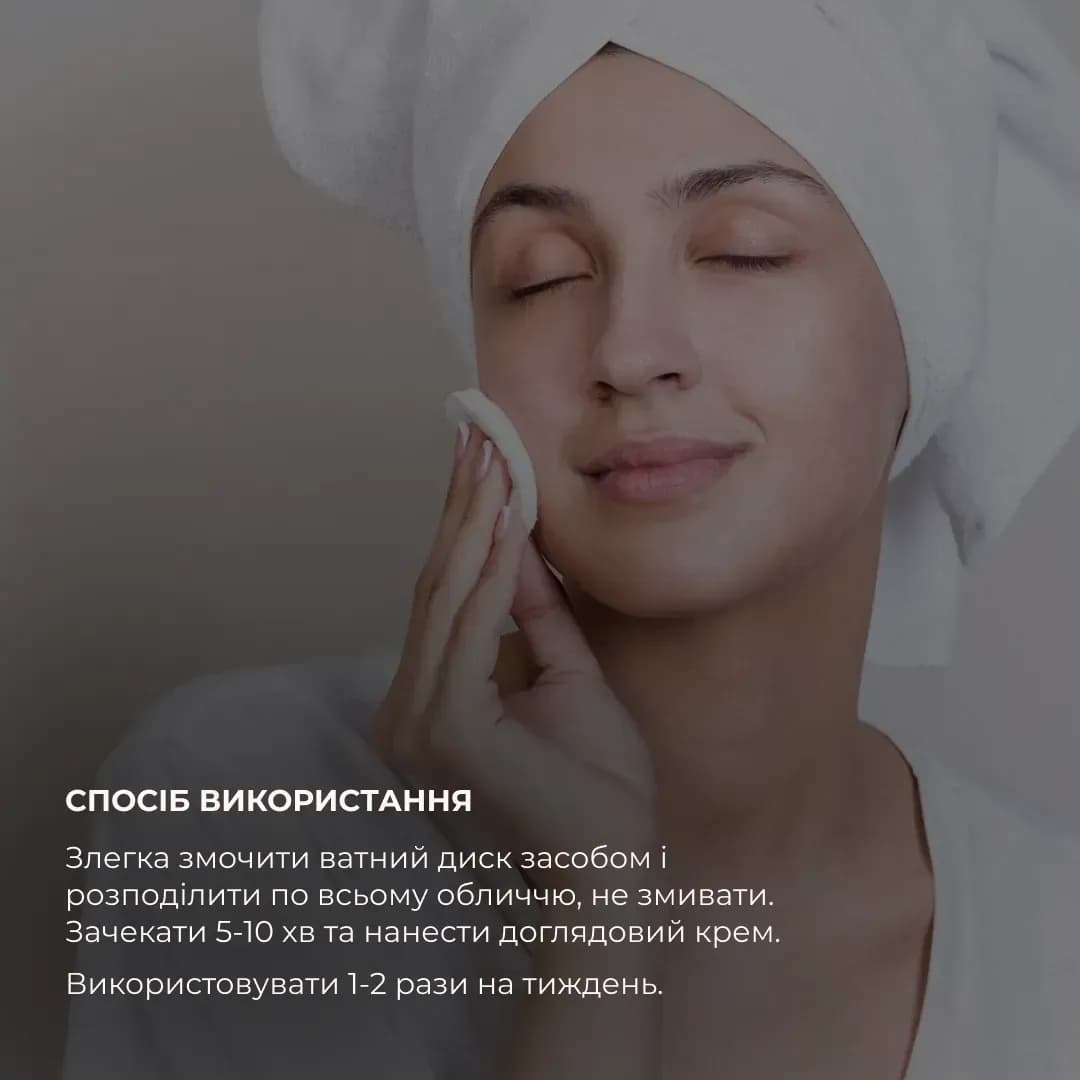2. Злегка змочити ватний диск тонером і розподілити по всьому обличчю, не змивати. Використовувати 1-2 рази на тиждень.