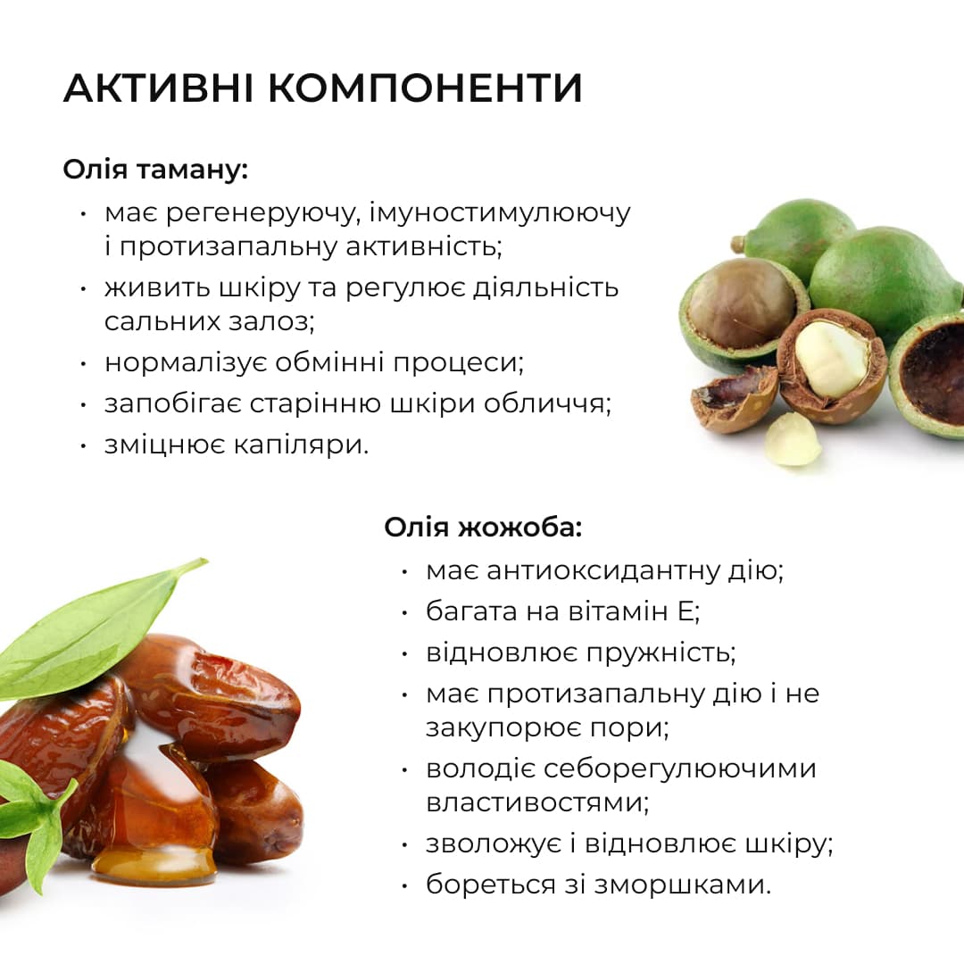 Завдяки олії таману пінка регулює діяльність сальних залоз, а олія жожоба живить і зволожує шкіру, допомагаючи підтримувати її пружність та еластичність.