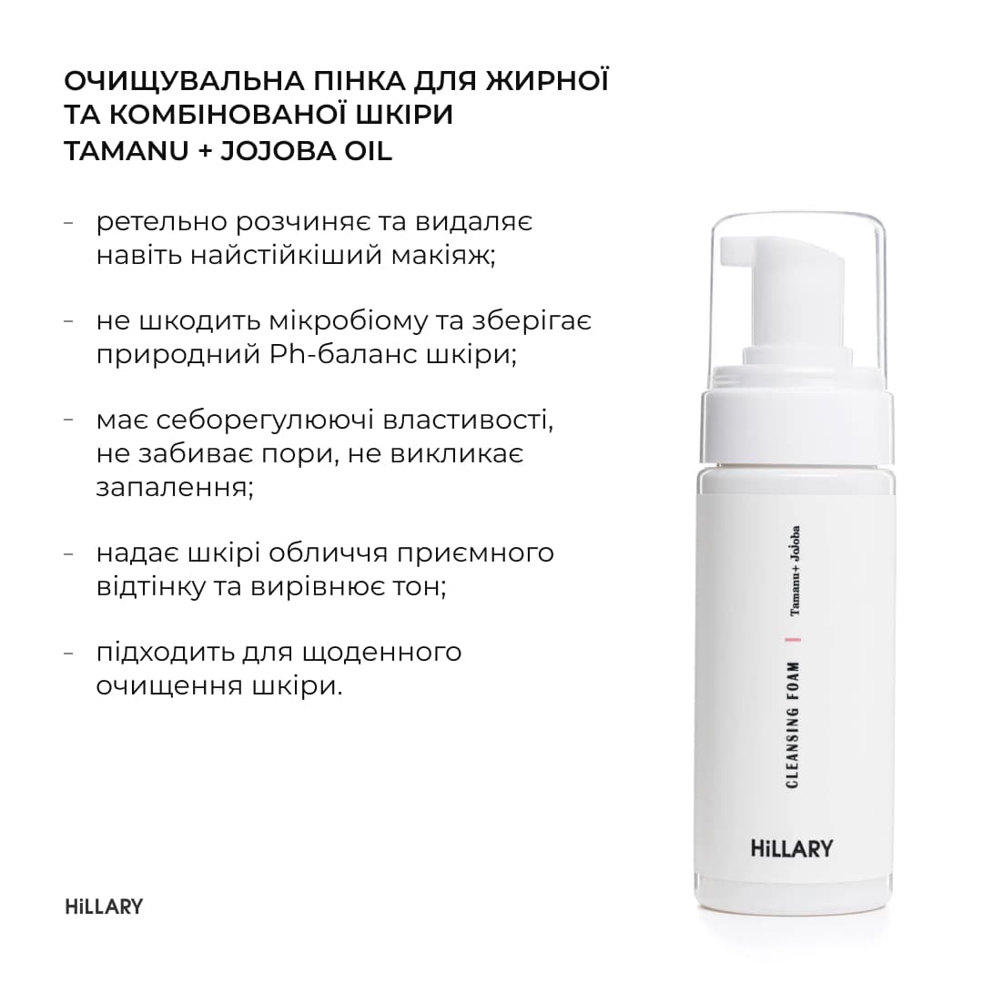 - Очищуюча пінка для жирної та комбінованої шкіри Hillary Cleansing Foam Tamanu + Jojoba oil, 150 мл