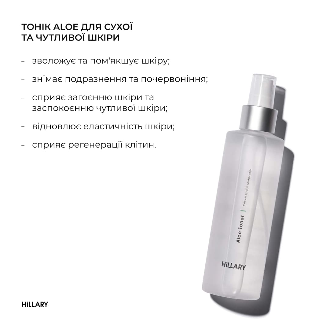 - Тонік для сухої та чутливої шкіри Hillary Aloe Toner, 200 мл;