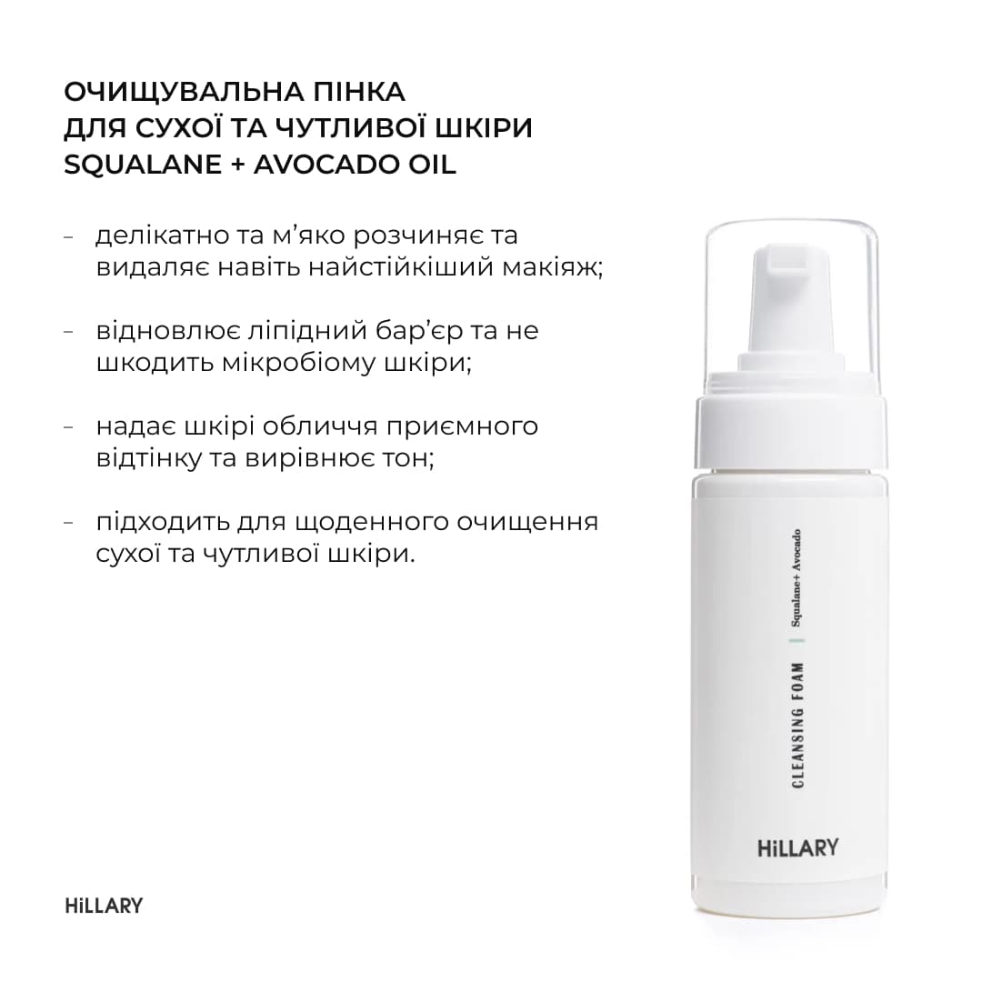 - Очищуюча пінка для сухої та чутливої шкіри Hillary Cleansing Foam Squalane + Avocado oil, 150 мл