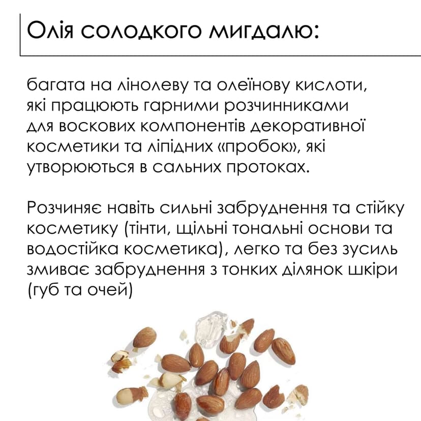 Ніжний бальзам ефективно видаляє макіяж і бруд, не подразнюючи шкіру та не залишаючи на ній неприємної жирної плівки. Бальзам на основі мигдальної олії та ефірів ши має консистенцію, що нагадує чисту олію ши та легко тане на сухій шкірі обличчя, очей і губ. Розчиняє залишки декоративної косметики та очищує пори від надлишків шкірного себуму. При контакті з водою перетворюється на ніжне молочко. Легко змивається, не залишаючи жирної плівки.