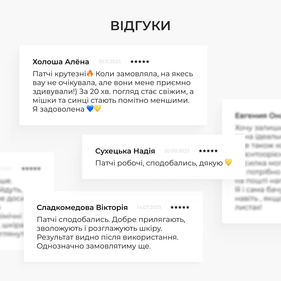 Патчі мають зволожувальний і тонізувальний ефект, зменшуючи набряклість і темні кола.