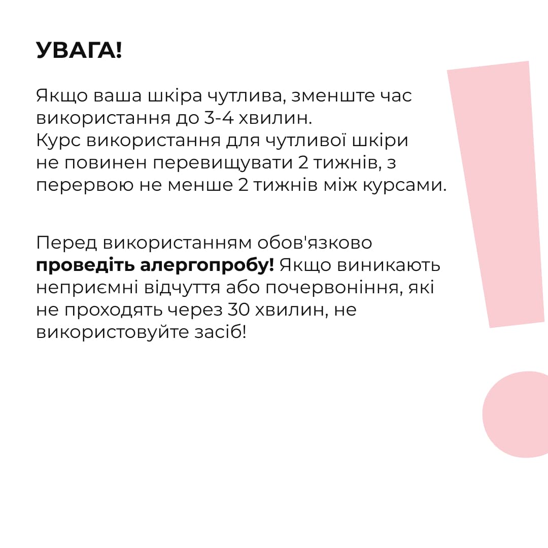 Увага! Патчі містять високу концентрацію активних компонентів для найкращої ефективності дії. З обережністю використовувати для чутливої шкіри та при схильності до алергічних реакцій, зменшити тривалість впливу до 3-4 хвилин при чутливості. Для чутливої шкіри курс використання не повинен перевищувати 2 тижні з перервою не менше 2 тижнів між курсами. Обов‘зково провести алергопроби перед використанням! У разі появи неприємних відчуттів, почервонінь, що не проходять самостійно через 30 хв., засіб не використовувати!