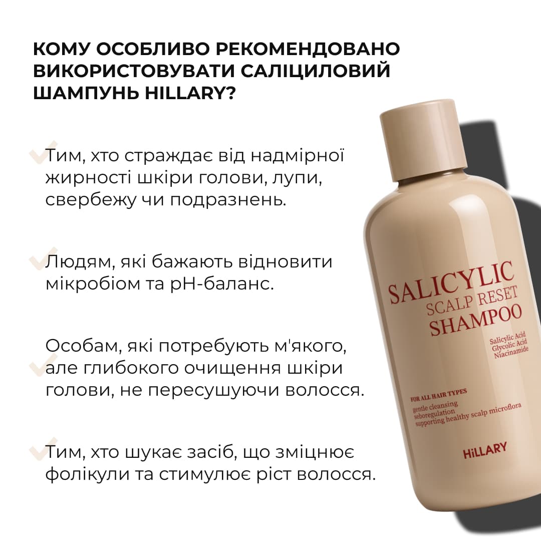 Саліциловий шампунь Hillary – це інноваційний засіб, створений для тих, хто бореться з надмірною жирністю шкіри голови, лупою, свербежем або уповільненим ростом волосся. Завдяки продуманому складу з саліциловою кислотою (BHA), гліколевою кислотою (AHA), ніацинамідом, кофеїном і пребіотиками, шампунь діє цілеспрямовано, але делікатно, відновлюючи мікробіом і природний pH шкіри голови.