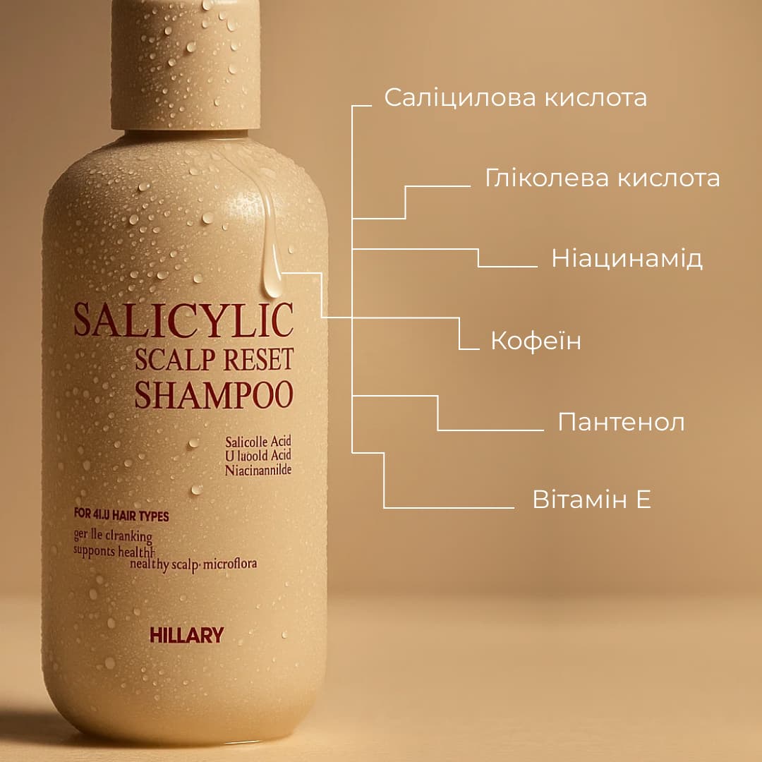 Hillary Salicylic Scalp Reset Shampoo має приємну м’яку текстуру та тонкий аромат цитрусової свіжості, легко піниться і змивається, не залишаючи відчуття сухості.