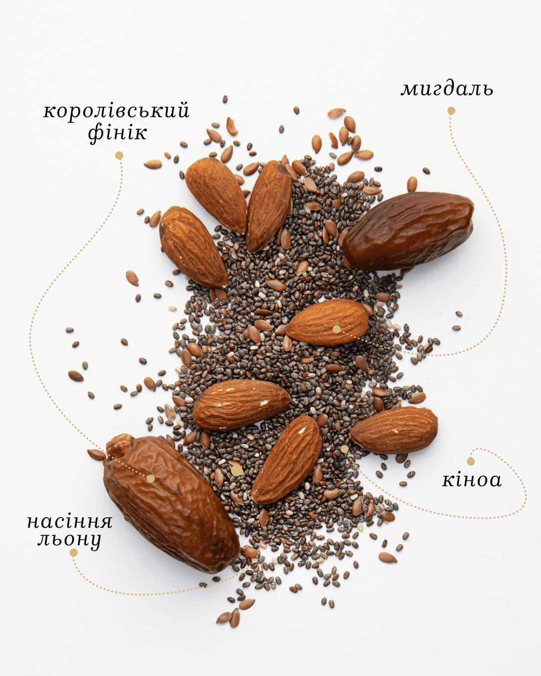 Гранола Gregory Mill Finik - вишукане поєднання солодкого фініку з хрустким мигдалем. Фініки здавна символізують життя та плодючість, адже про їх користь відомо з древніх часів. Саме тому ми використовуємо відбірні королівські фініки, щоб збагатити смак граноли цією величчю смаку.