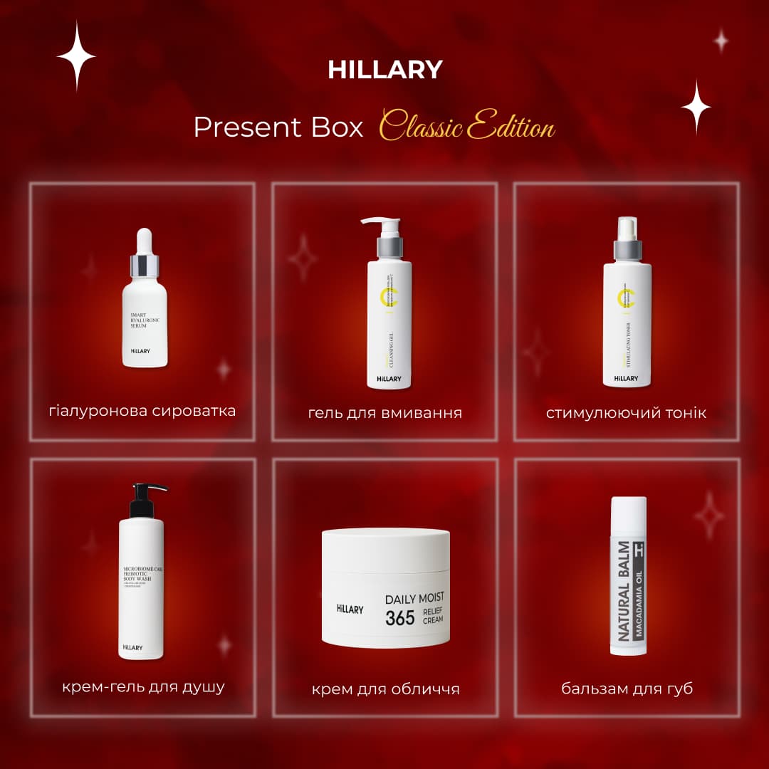Кожен засіб має продуману формулу, легку текстуру та делікатний аромат, що перетворює звичайний догляд на справжній момент задоволення. Hillary Present Classic Edition – це гармонійне поєднання ефективності, турботи та краси у кожній деталі.