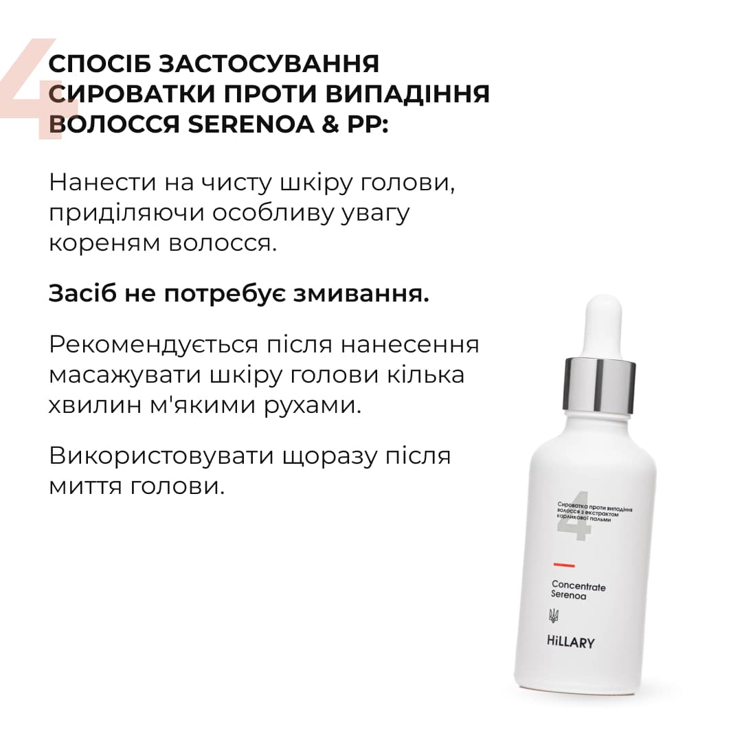 1. Екстракт сереноа продовжує тривалість життєвого циклу волосся, в результаті чого його випадіння скорочується. Оздоровлює шкіру, відновлюючи та підтримуючи нормальну мікрофлору. Сереноа блокує дію ферменту 5-альфа-редуктази, що перетворює тестостерон в дигідротестостерон (DHT). Висока кількість DHT в організмі може призвести до збільшення випадіння волосся.
