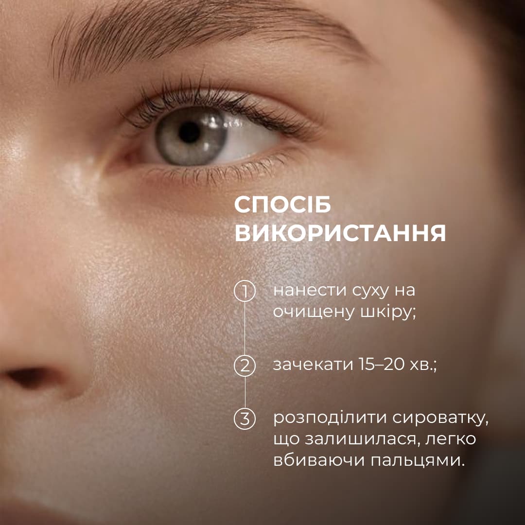 Спосіб використання: Наносьте гідрогелеві патчі на чисту суху шкіру під очима на 15-20 хвилин вранці, увечері або за потреби. Можна наносити також на носогубні складки, лоб або шию. Викиньте патчі після використання і розподіліть сироватку, що залишилася, по шкірі, легко вбиваючи пальцями.